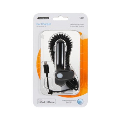 COMPATIBILITY: APPLE iPHONE 5. APPLE iPOD TOUCH 5th Generation, APPLE iPOD NANO 7th Generation, APPLE iPAD MINI, APPLE iPAD 4th Generation. Never run out of juice on the road with the Original AT&T Vehicle Power charger. Stay connected and talk longer knowing that if your battery ever runs low, you can just plug the car charger into any vehicle's power socket (cigarette lighter). BONUS USB PORT: Charger has a special hidden slot so you can connect a usb cable. This is cool because you can now charge two devices with one charger. Most electronic devices charge with usb connection (such as iPod, MP3 player, Playstation, cell phone, PDA, GPS, bluetooth, etc). Turn the swivel cap to reveal the secondary USB port. Turn the swivel cap back in place to conceal the usb port when not in use. WARRANTY: This Apple Car Charger is manufactured by AT&T to meet and exceed the highest standards of quality and performance. This charger features AT&T brand logo. The AT&T store will tell you that aftermarket chargers will void your warranty -- Enjoy peace of mind, knowing that your phone will remain within warranty rules by using this AT&T brand charger. AT&T part numbers 4617A / 05252 This charger is one piece construction - so you don't have to fool around with separate cables/adapters. The coiled cord will stretch to 9 feet so you will always be within range to charge. This is the exact same charger you'll see at the AT&T store for $30.00. Buy here and save! ________________________________________ COMPATIBILITY: Although this is "AT&T" brand charger, you can still use it with other brand iPhones such as Verizon and Sprint etc. Also compatible with iPods and iPads that use lightning connector. Examples of compatible models include: APPLE iPHONE 5. APPLE iPOD TOUCH 5th Generation, APPLE iPOD NANO 7th Generation, APPLE iPAD MINI, APPLE iPAD 4th Generation.